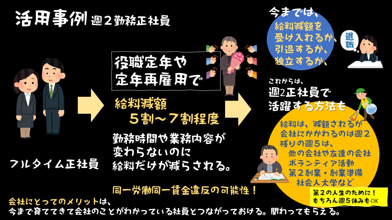 パターン4)定年退職後「週2正社員」で継続。 (社会保険を維持しつつ、残りの5日はのんびりするもよし、ボランティアをするもよし、学び直しや第2の人生へ進むことも可能!)