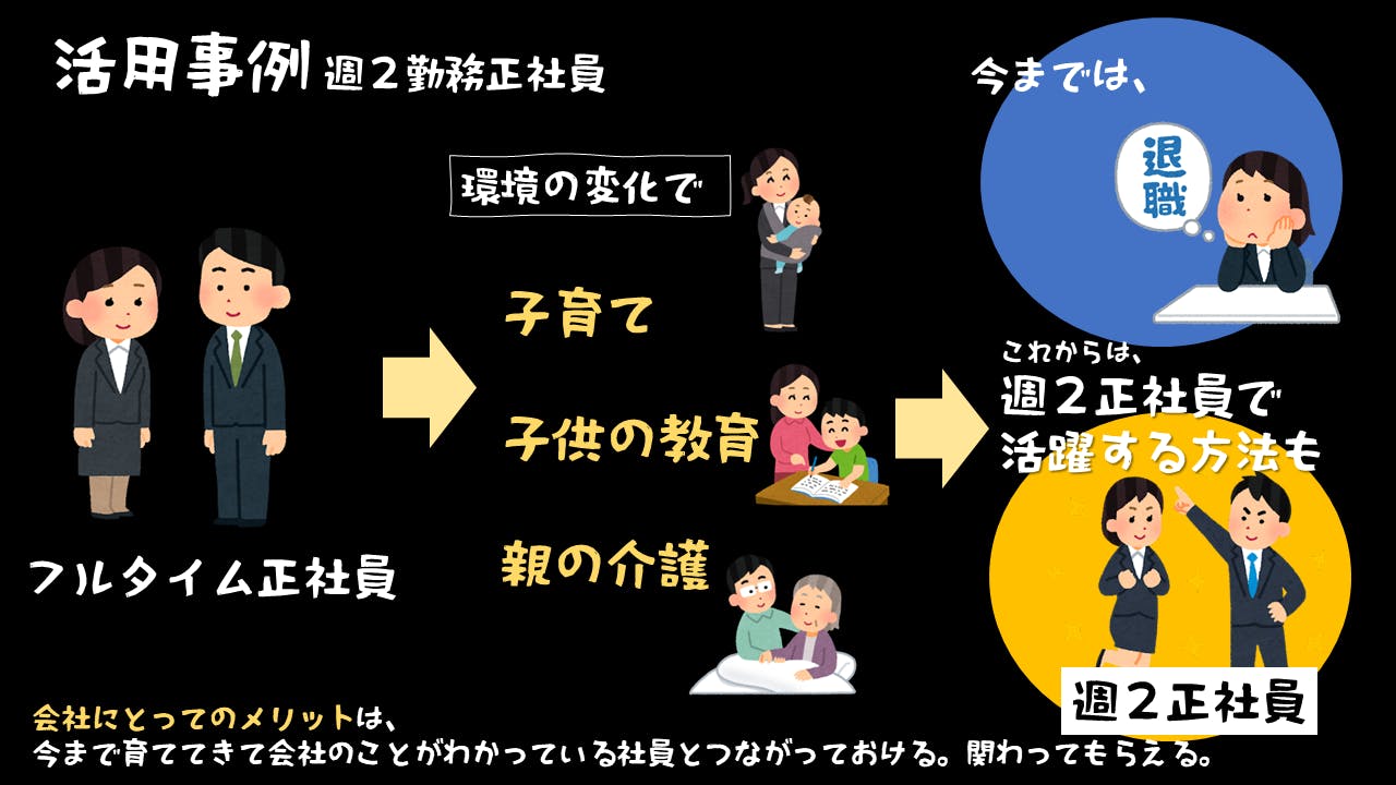 さまざまな選択肢がありながらも、会社・働く人、やはりそれぞれに悩みは生まれます。それらを解決する選択肢となりうる働き方が「週2正社員」なのです。